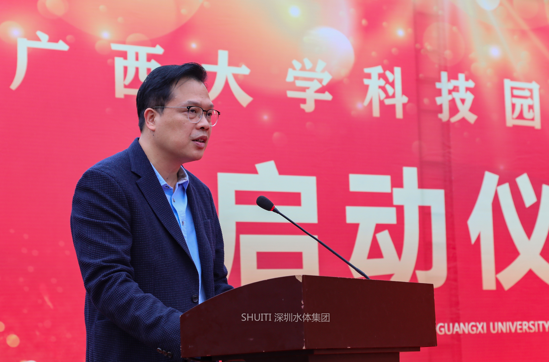 項(xiàng)目建設(shè)方廣西大學(xué)資產(chǎn)經(jīng)營有限公司黨委書記、董事長葉志青,廣西大學(xué)科技園項(xiàng)目投資合作方深圳市水體實(shí)業(yè)集團(tuán)有限公司董事長何文,項(xiàng)目施工總承包單位中國建筑第八工程局南方公司副總經(jīng)理陶暑生,南寧高新技術(shù)產(chǎn)業(yè)開發(fā)區(qū)管理委員會(huì)主任李耕,廣西大學(xué)黨委副書記、副校長吳盡昭分別在會(huì)上致辭。