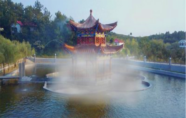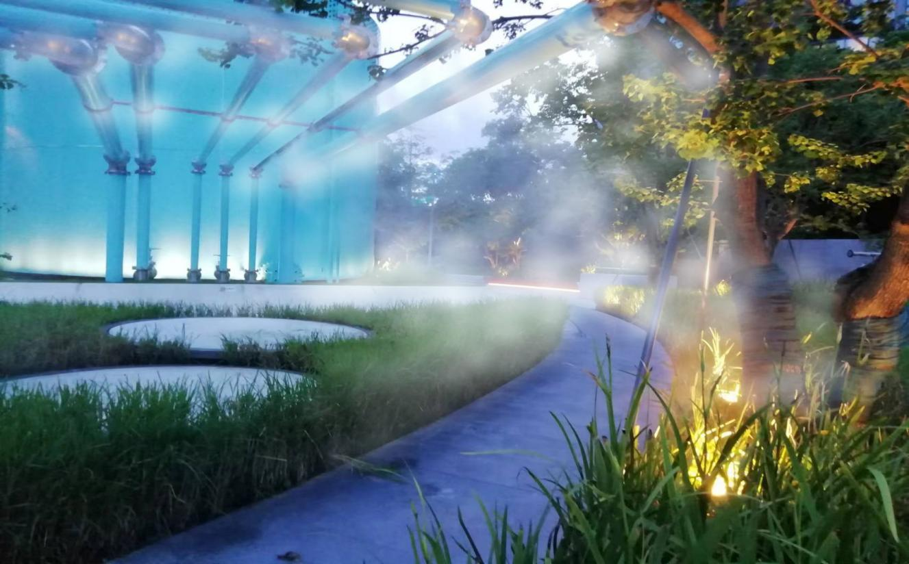 景觀、雕塑與水景是現(xiàn)代園林景觀不可缺少的元素,如果再加入那若隱若現(xiàn)的霧景,會讓人們萌生出濃厚的神秘感。置身于茫茫霧海中,加以光影映襯,幻化七彩迷人景觀,如臨夢幻般美妙絕倫的仙境,同時呼吸著濕潤新鮮的空氣,讓人真正體驗到回歸自然般的心曠神怡。