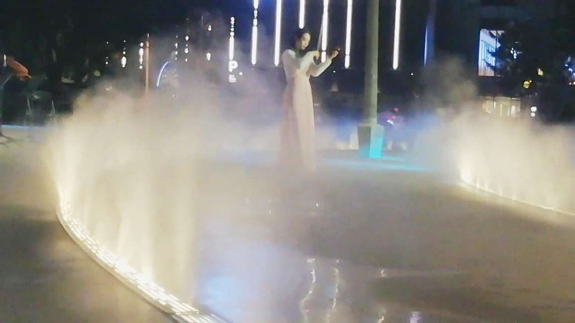 霧屏是多媒體展示產(chǎn)品,是通過使用超聲集成霧化發(fā)生器產(chǎn)生大量微粒霧,結(jié)合空氣流動學原理而制造出來的能產(chǎn)生形成平面霧氣的屏幕。霧屏系統(tǒng)利用微粒霧平面特性作為光路載體,再將特制的流暢生動的媒流體投射在該載體上便可以在空間中形成虛幻立體的影像,形成一種三維空間立體圖像,給人一種新的立體視覺享受。真人可進入霧屏畫面的虛幻效果,是一種新型的以霧為媒體的獨特創(chuàng)新水景。