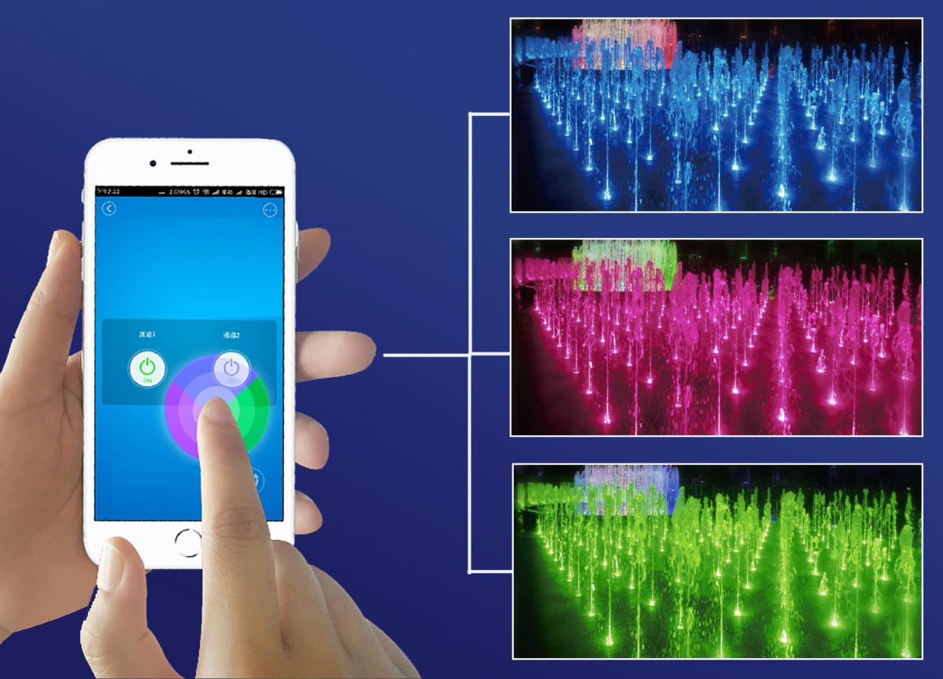 (手機(jī)通過(guò)遠(yuǎn)程控制可以實(shí)現(xiàn)噴泉水景燈光控制)